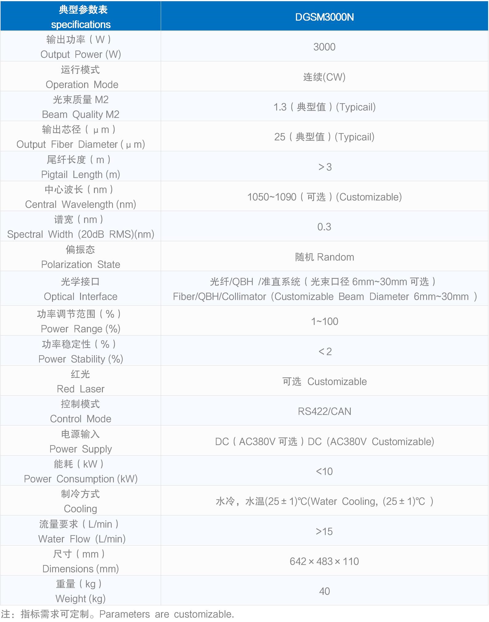 可實現(xiàn)3kW輸出激光的光譜帶寬(20dBRMS)小于0.3nm,中心波長1050nm~1090nm可選,中心波長偏差不大于0.1nm,可滿足光譜合成等應(yīng)用。