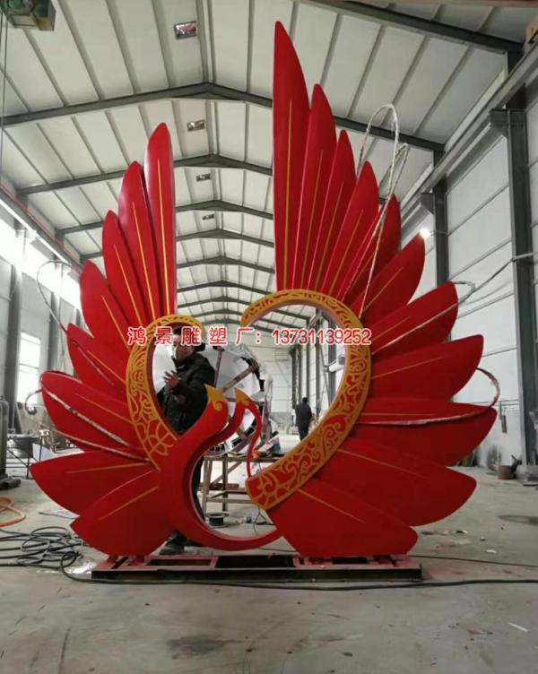 比翼雙飛不銹鋼仿銅雕塑以現(xiàn)代抽象藝術(shù)手法,將中國傳統(tǒng)文化中象征祥瑞的鳳凰意象進(jìn)行創(chuàng)新詮釋。這組雙鳳雕塑采用304不銹鋼材質(zhì),經(jīng)特殊電鍍工藝處理,呈現(xiàn)出古樸典雅的仿銅質(zhì)感,金屬表面流轉(zhuǎn)著青銅器般的啞光色澤,在光影交錯間折射出深淺不一的光暈。藝術(shù)家通過幾何化的塊面構(gòu)成,將鳳凰舒展的羽翼提煉為流暢的弧形線條,尾羽化作層疊的金屬薄片,在微風(fēng)中仿佛能聽見金屬碰撞的清脆回響。兩只鳳凰以鏡像對稱的姿態(tài)盤旋上升,頸部優(yōu)雅地交疊成心形輪廓,既保留了傳統(tǒng)"比翼鳥"的浪漫寓意,又賦予作品強(qiáng)烈的現(xiàn)代構(gòu)成感。雕塑基座采用黑色花崗巖打磨,與金屬主體形成剛?cè)岵?jì)的視覺對比,底座上蝕刻的云紋暗合"鳳舞九天"的吉祥典故。當(dāng)夕陽西下時,金屬表面會捕捉最后一縷天光,使整件作品如同浴火重生的鳳凰般熠熠生輝,為城市空間注入永恒的生命力與東方美學(xué)意境。
